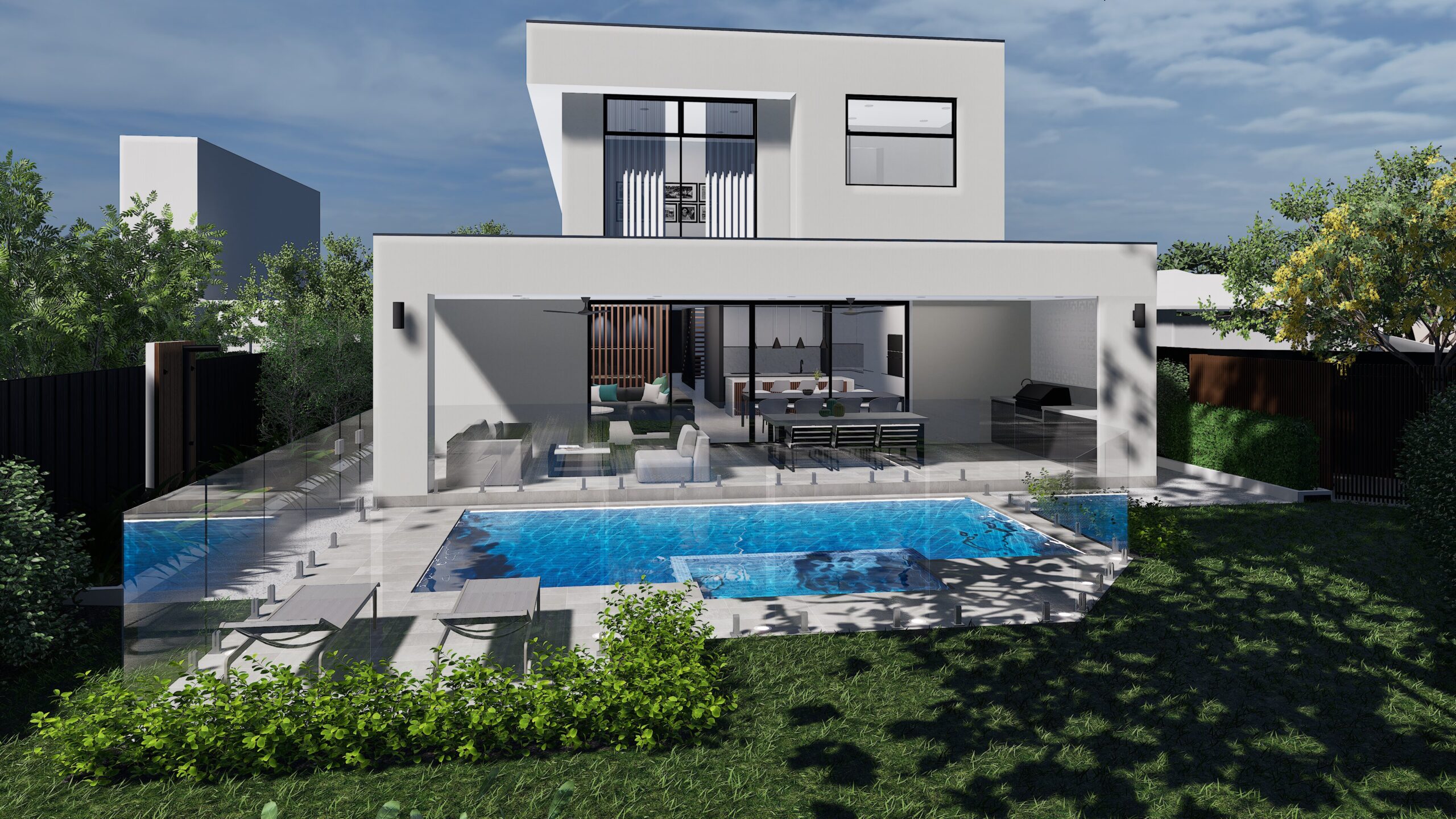 This outdoor area is perfect for hosting gatherings, enjoying family time, or simply unwinding in a serene environment. The spacious alfresco area seamlessly blends indoor and outdoor living, connecting the open-plan living space and the large pool. It's a beautiful space, perfect for entertaining or simply enjoying the outdoors. The backyard features a lovely pool, ideal for cooling off on hot days or enjoying a leisurely swim. The pool is surrounded by a beautifully landscaped garden with lush greenery that complements the modern design of the home.