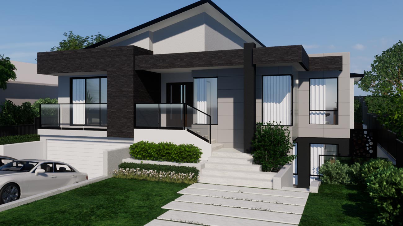 The Neasham Drive House was designed with a strong external form and a simple material palette. This house has a prominent skillion roof, making it a noticeable feature from any angle. The beautifully dark textured panel cladding against the soft off-white finish creates a facade with a unique and modern aesthetic.